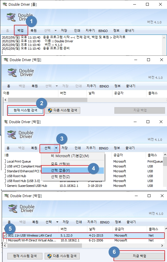 꼭 필요한 드라이버 (보통은 무선랜카드, 필요에 따라 그래픽카드 등)를 체크하고 (6) 백업을 눌러주세요.
